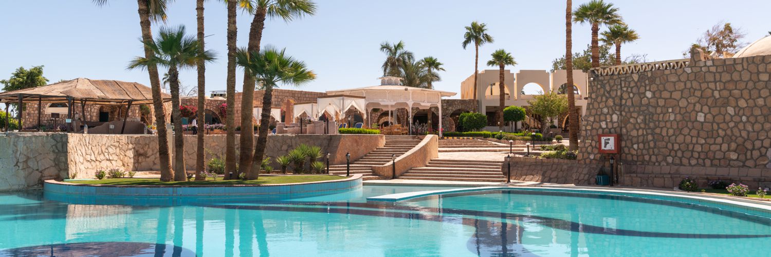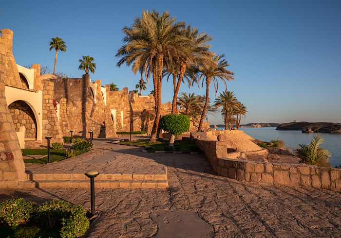 The hotel features Nubian-style domes, lush greenery, and cascading waterfalls, creating a tranquil ambiance.